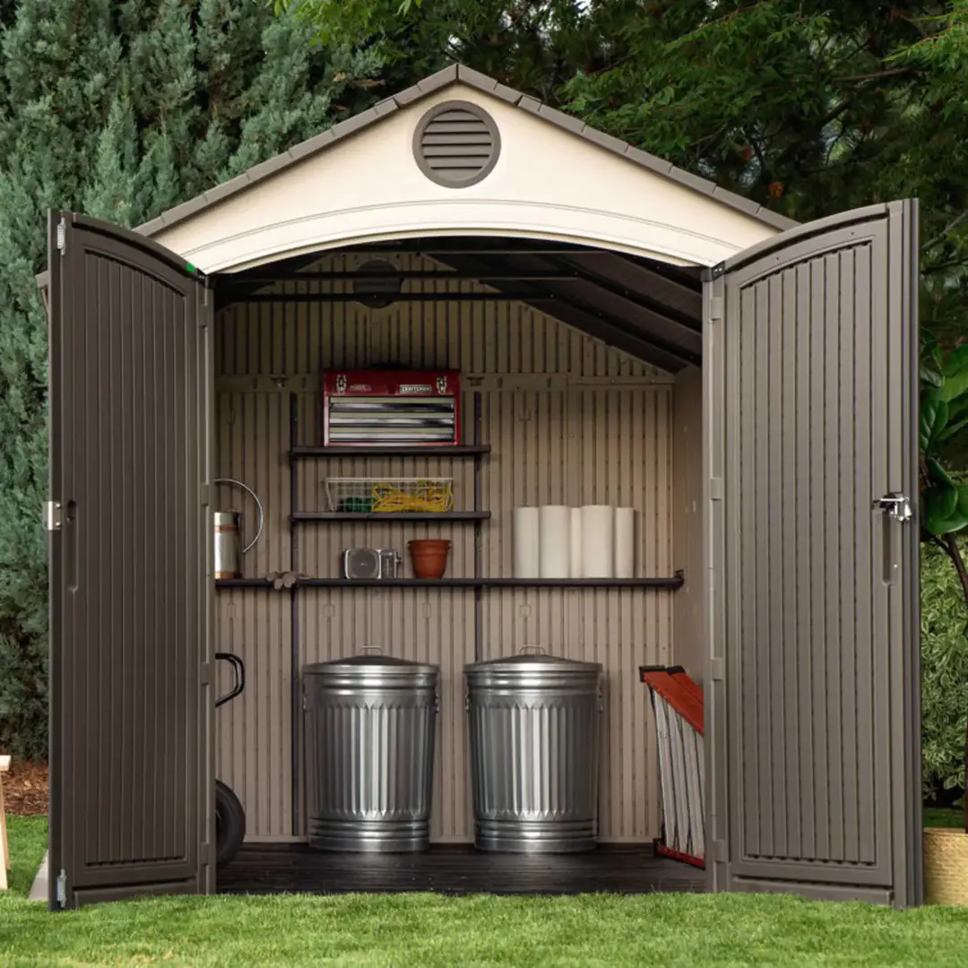 It can be a challenge to find the right storage solution. You may need to store a lawn mower, kayaks, and bikes while still having space for smaller items like gardening tools or lawn equipment. Lifetime’s Outdoor Storage Sheds provide versatile storage options that are durable and secure. The steel-reinforced dual-wall panels along with lockable doors safely secure your belongings. Steel trusses provide additional roof strength and the high-pitched roof helps for quick drainage. The customizable shelving system allows you to store smaller items more effectively. The clean, stylish design of the shed requires no maintenance and will look great in your yard for years.