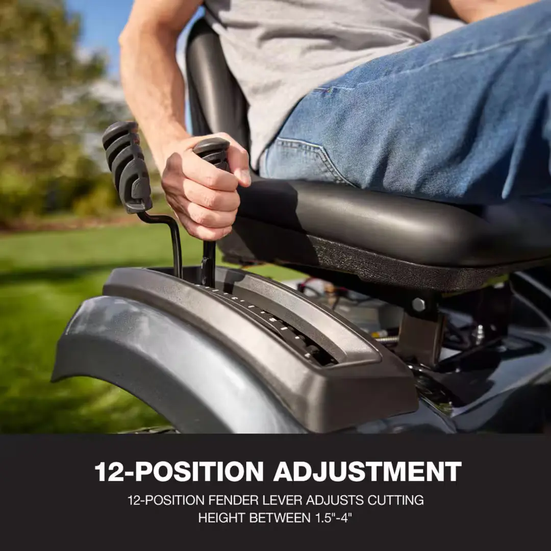 Adjustable Cutting Height, Adjustable Speed, Assembly Required, Battery level indicator, Built-in Hitch, Cruise Control, Cup Holder, Deck cleanout, Headlights, Hour Meter, Keyed start, Pneumatic Tires, Residential, Reverse Mowing, Rust resistant deck, Single-lever height adjustment, Translucent Fuel Tank |